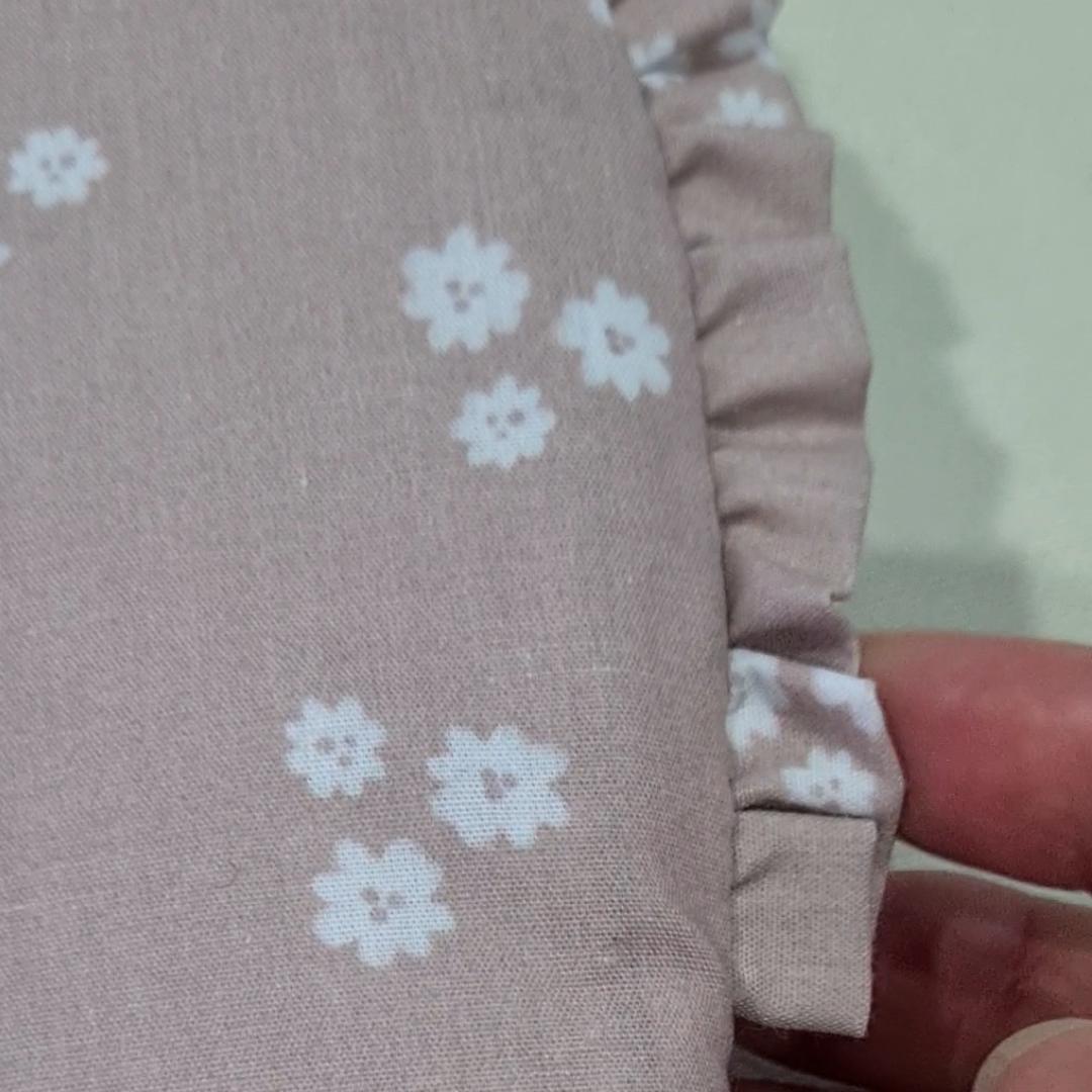 Por un lado en tejido batista estampada con volante fruncido en todo el borde. Por el otro lado en tejido piqué de algodón en liso.