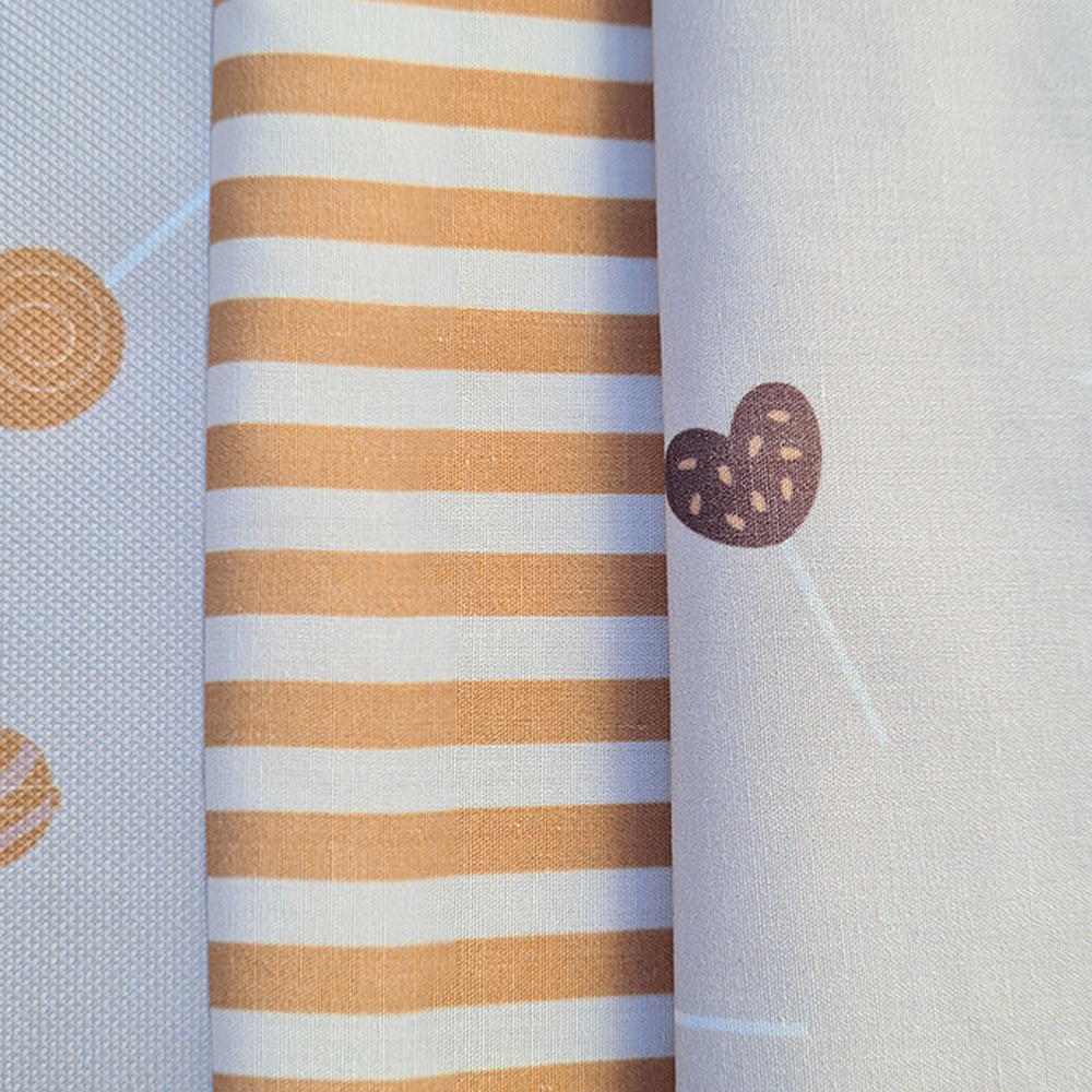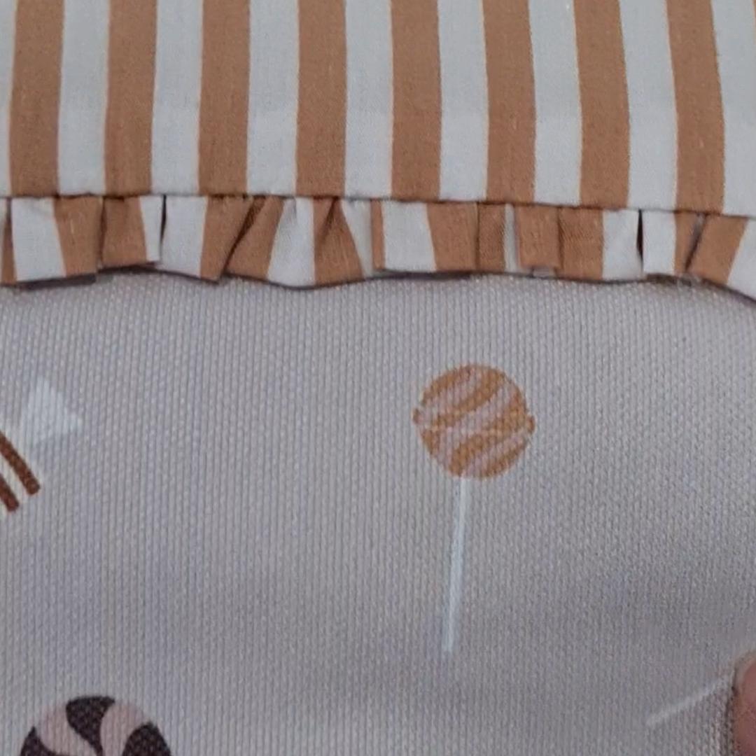 Por un lado en tejido batista estampada con volante fruncido en todo el borde. Por el otro lado en batista estampada.