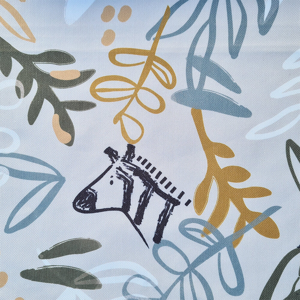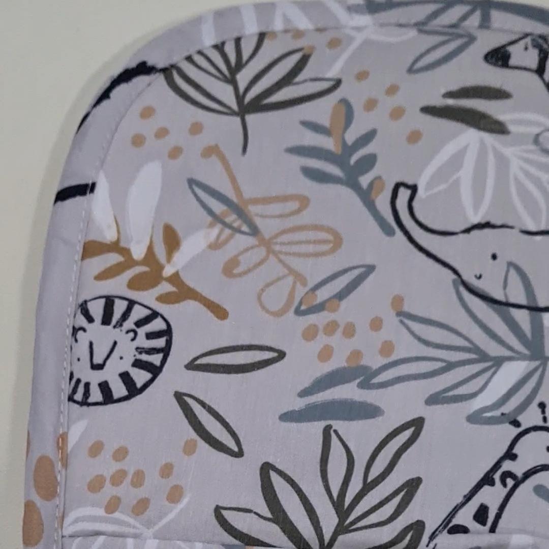 Por un lado en tejido batista estampada, por el otro lado en tejido piqué de algodón en liso. El relleno de la funda es una micro fibra hueca para mayor confort del bebé y muy buena transpirabilidad.