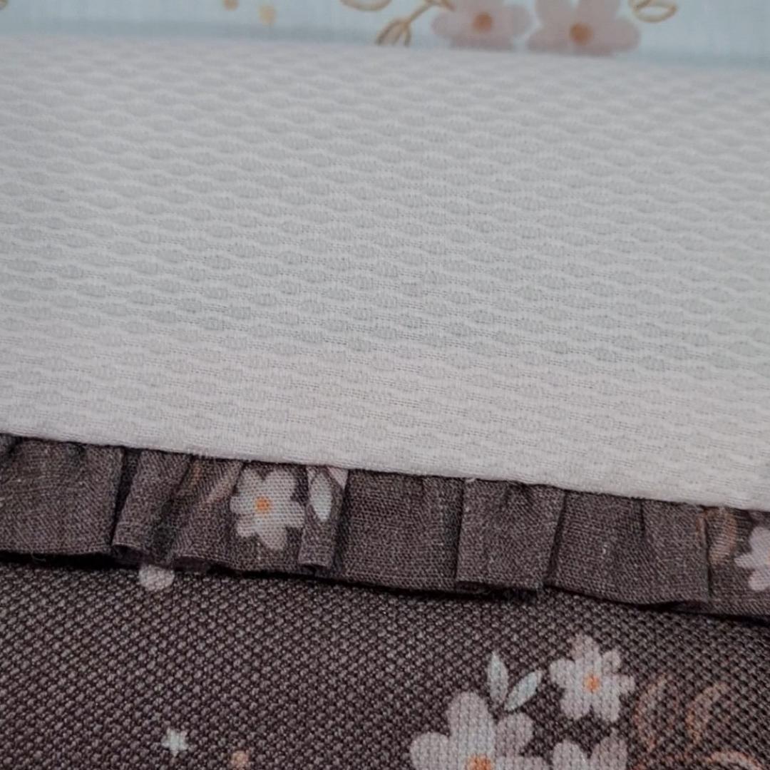 4. Colcha en piqué estampado con volante fruncido en todo el borde, va por encima del capazo, cubriendo la parte de arriba del capazo y los bordes en lateral, es una colcha con cinturón para que se ajuste mejor.