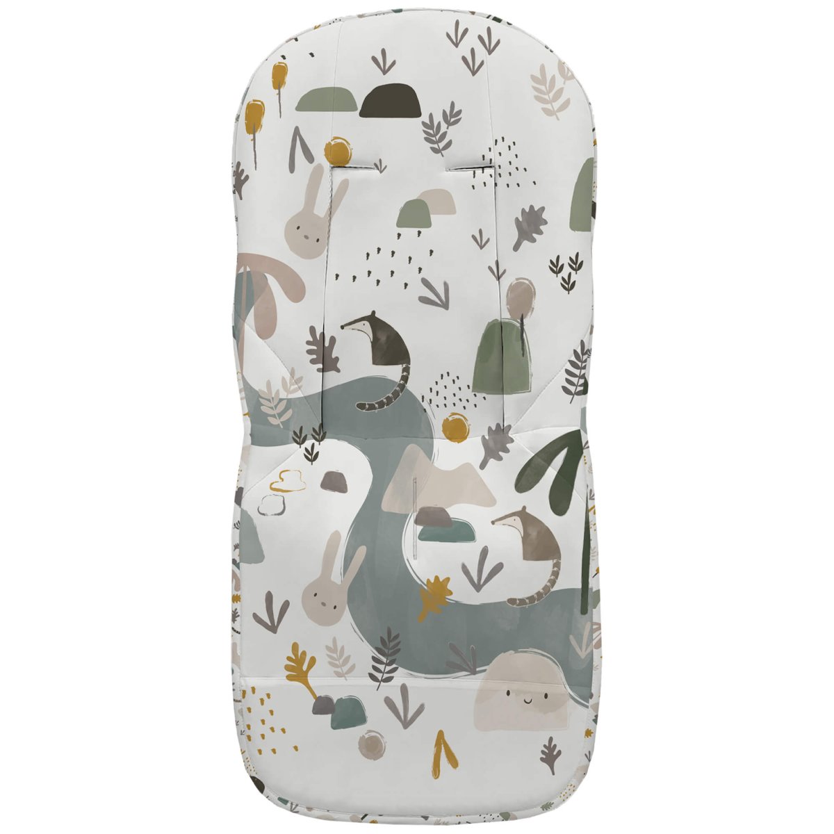 La funda en tejido piqué estampado, en la zona de los pies para las rozaduras de los zapatitos y la suciedad un tejido impermeable de fácil limpieza y realizado a partir de plásticos reciclados.