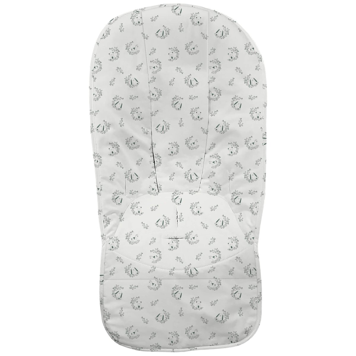 La funda en tejido piqué estampado, en la zona de los pies para las rozaduras de los zapatitos y la suciedad un tejido impermeable de fácil limpieza y realizado a partir de plásticos reciclados.