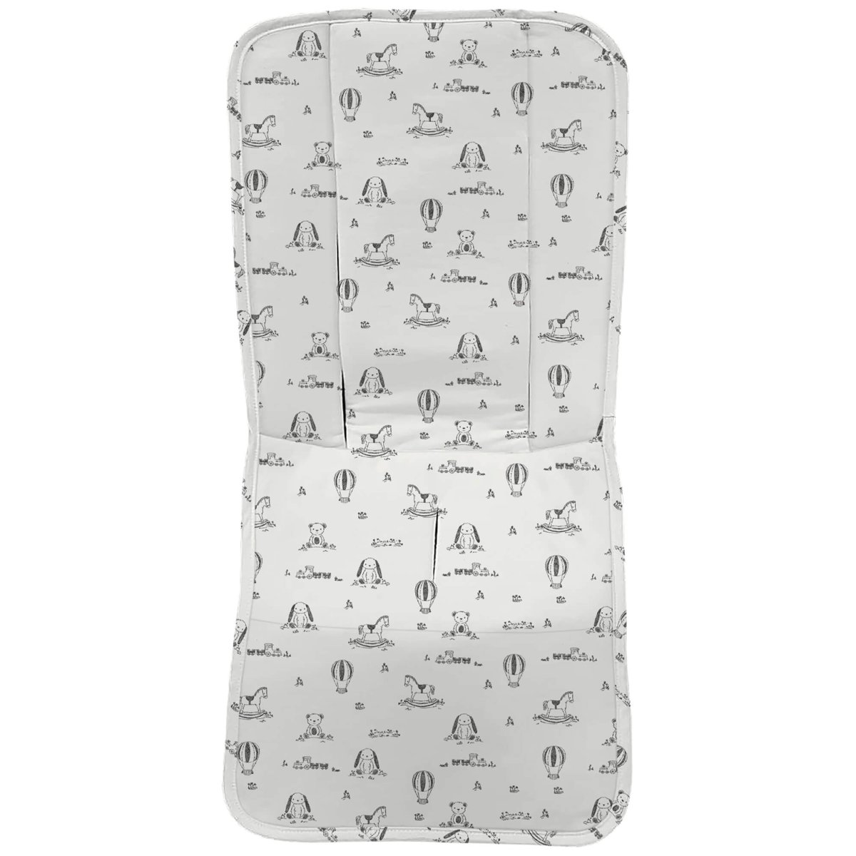 La funda en tejido piqué estampado, en la zona de los pies para las rozaduras de los zapatitos y la suciedad un tejido impermeable de fácil limpieza y realizado a partir de plásticos reciclados.