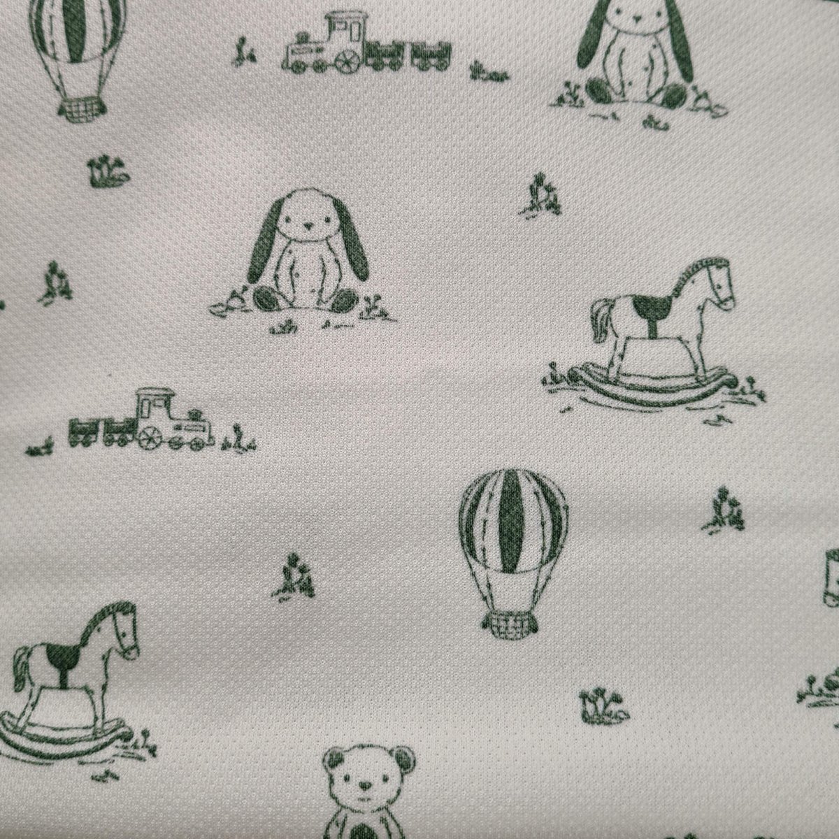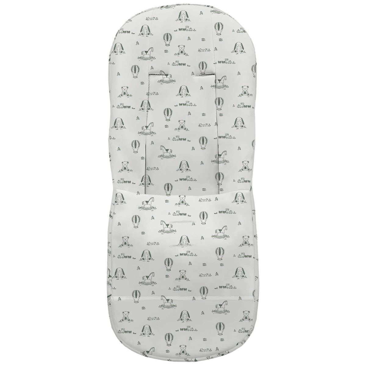 La funda en tejido piqué estampado, en la zona de los pies para las rozaduras de los zapatitos y la suciedad un tejido impermeable de fácil limpieza y realizado a partir de plásticos reciclados.