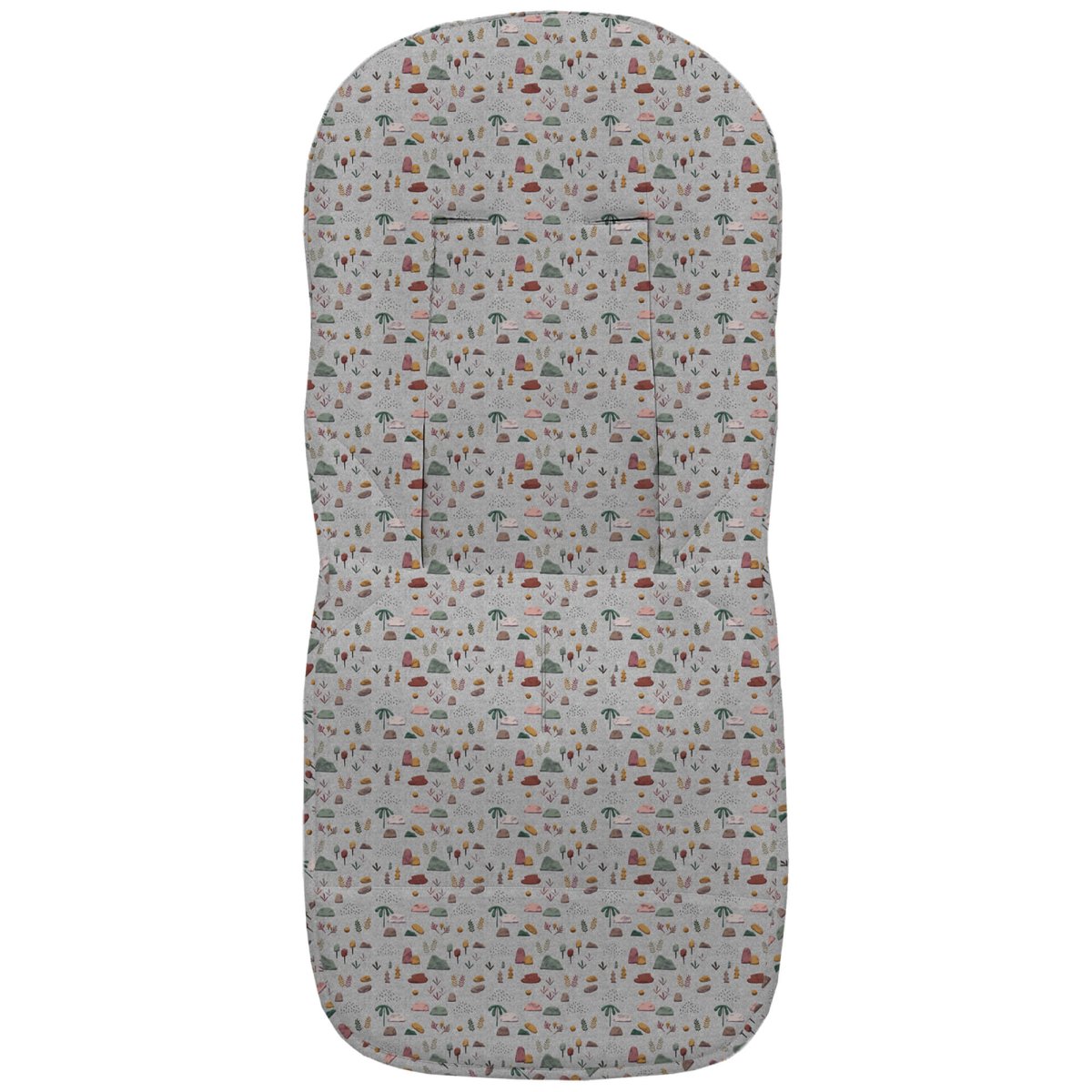 La funda en tejido piqué estampado, en la zona de los pies para las rozaduras de los zapatitos y la suciedad un tejido impermeable de fácil limpieza y realizado a partir de plásticos reciclados.