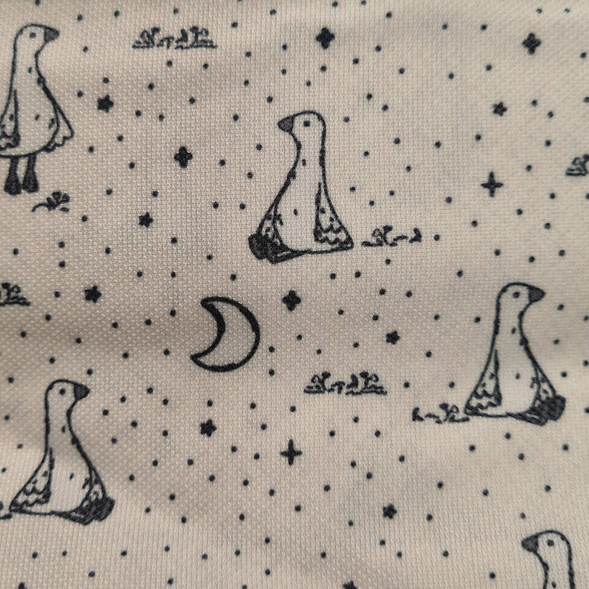 La funda en tejido piqué estampado, en la zona de los pies para las rozaduras de los zapatitos y la suciedad un tejido impermeable de fácil limpieza y realizado a partir de plásticos reciclados.