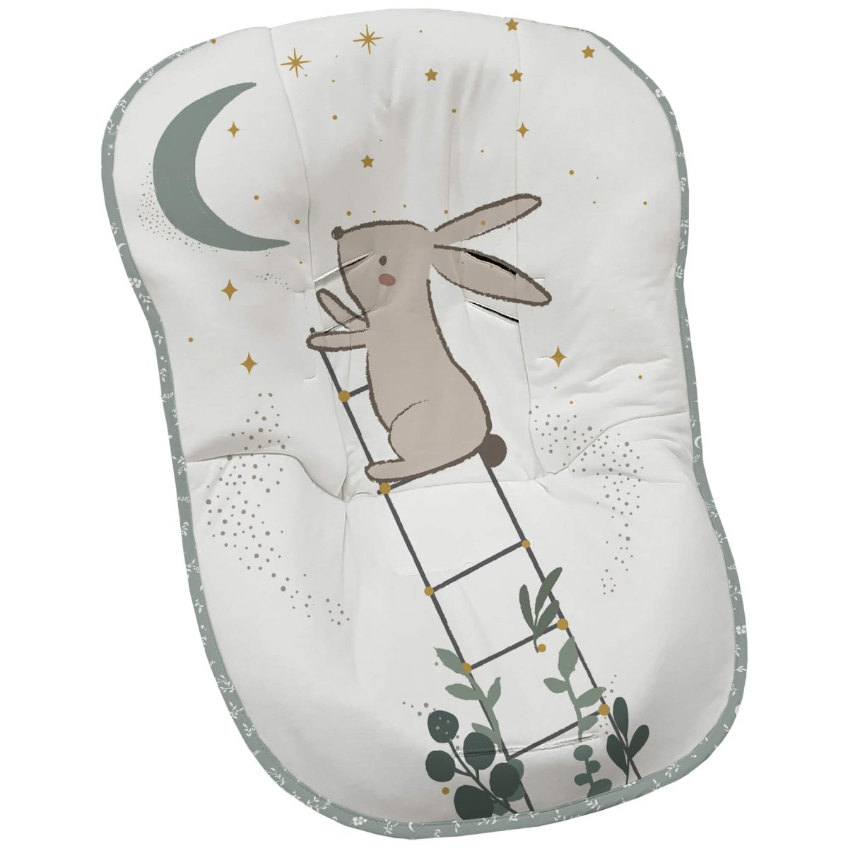 El tejido para la funda en piqué estampado. Con un relleno de micro fibra hueca para mayor confort del bebé y muy buena transpirabilidad. Por el revés un tejido rejilla 3D para una mejor ventilación.
